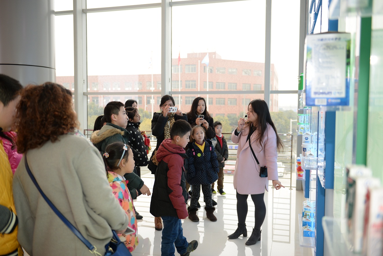 2月3日上午9點,活動第一天,18個參與活動的職工家庭在吳中路光明乳業(yè)總部集合,整裝待發(fā)。約十點鐘左右到達華東中心工廠。進廠后車子先繞廠一圈,由工作人員向小朋友們介紹工廠環(huán)境,在大致了解工廠情況之后小朋友和家長們下車到大廳集合并進行合影留念。