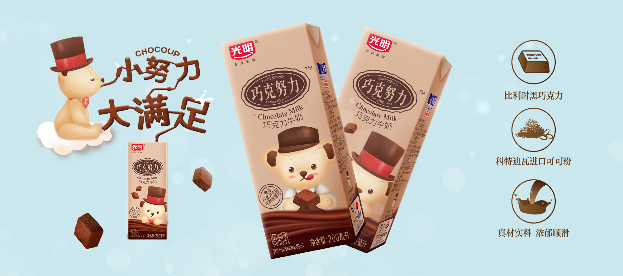 光明巧克努力200ml巧克力牛奶,由比利時(shí)進(jìn)口黑巧克力、“象牙海岸”科特迪瓦的可可粉與優(yōu)質(zhì)奶源完美搭配,口感香濃、滴滴醇厚,隨時(shí)隨地滿足你對(duì)美味的追求
