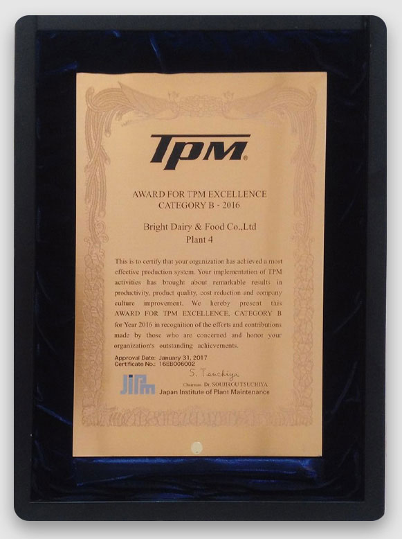 2010年,乳品八廠率先應(yīng)用WCM系統(tǒng),光明乳業(yè)由此成為中國乳品行業(yè)中第一家、也是唯一一家引進(jìn)WCM管理系統(tǒng)的乳品公司。光明乳業(yè)2012年順利通過審核,2013年獲得由“日本工廠設(shè)備維護(hù)協(xié)會(huì)JIPM”(JIPM-Japan Institute Of Plant Maintenance)頒發(fā)的TPM優(yōu)秀獎(jiǎng)(Total Productive Maintenance全面生產(chǎn)力維護(hù)),這也是目前國內(nèi)第一家獲得該國際大獎(jiǎng)的食品制造企業(yè)。 這是光明邁向“世界級(jí)制造”之路上的第一個(gè)腳印:未來,光明將不斷挑戰(zhàn)自我,持續(xù)改善,到達(dá)新高度。2018年,光明乳業(yè)旗下5家工廠通過日本JIPM審核,其中北京、廣州、富裕、中心工廠獲得TPM優(yōu)秀獎(jiǎng),乳品四廠通過TPM優(yōu)秀繼續(xù)獎(jiǎng)終審,成為國內(nèi)首家獲得此項(xiàng)殊榮的乳制品工廠。
