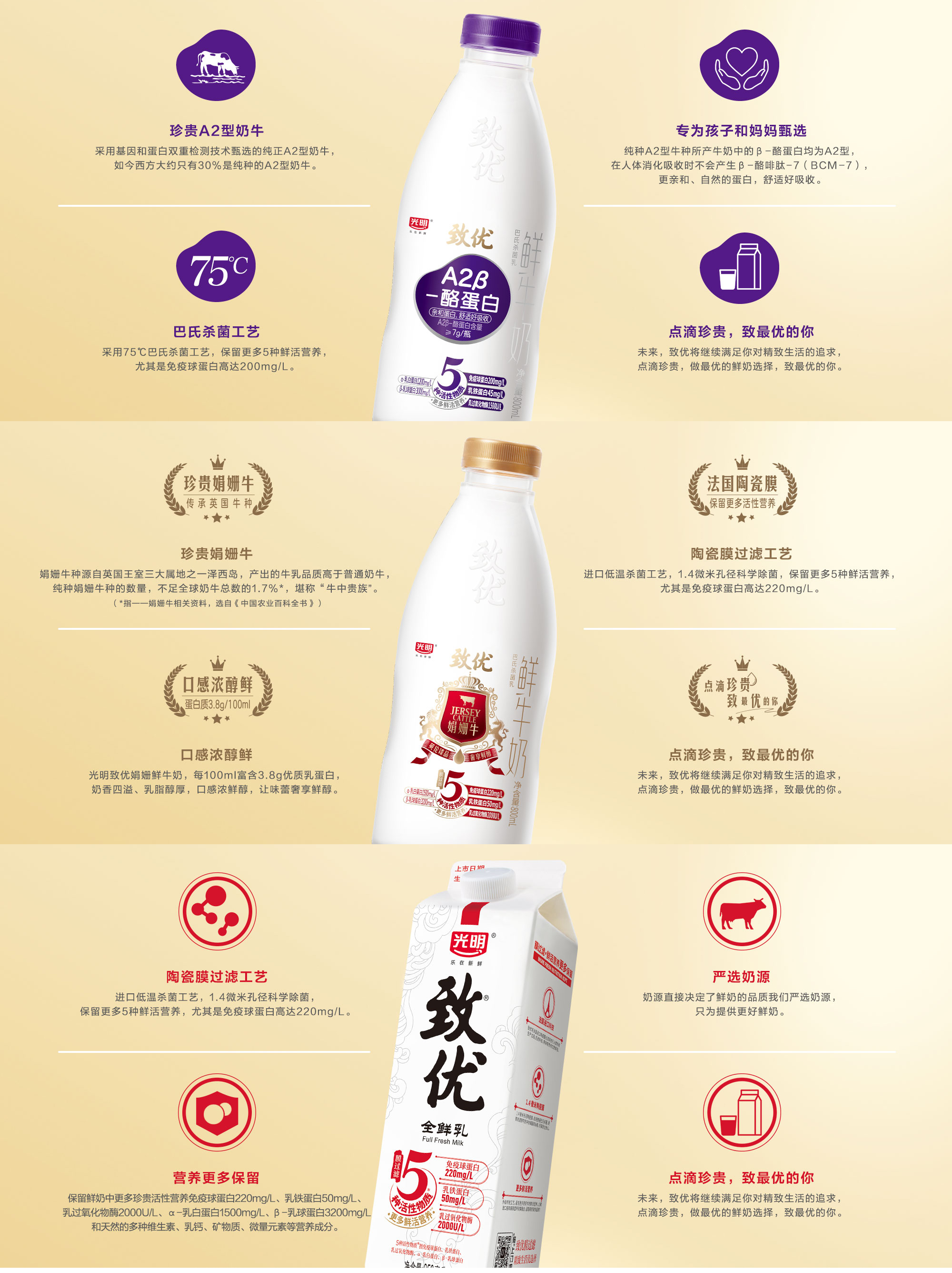 光明致優(yōu),國內(nèi)高端鮮奶品牌,從每一處細(xì)節(jié)開始追求極致,采用法國進(jìn)口陶瓷膜過濾工藝保留鮮奶中更多5種活性營養(yǎng),尤其是免疫球蛋白,同時(shí)引領(lǐng)著國內(nèi)高端鮮奶行業(yè)發(fā)展,上市的光明致優(yōu)娟姍鮮牛奶,牛種選用堪稱“牛中貴族”的娟姍牛口感濃醇鮮,受到英國王室成員彼得·菲利普斯的青睞,而推出的光明致優(yōu)A2β-酪蛋白鮮牛奶,親和營養(yǎng),專為孩子和媽媽甄選。